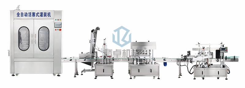 完成動作:人工放瓶-自動灌裝-機器放蓋-自動旋蓋–自動貼標-人工收瓶